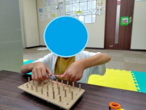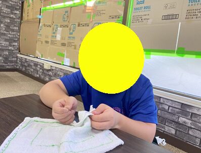 雑巾を丁寧に糸で縫って行ってくれるお友達!事前にスタッフがマーカーで色を塗ってくれたところを慎重に糸を通していきます!手先の柔軟さが試される裁縫(;´Д`)むずかしいですが、本人なりに真剣な顔立ちで、取り組んでくれていました!できた後は「できた!」と言ってスタッフに見せに来てくれました!よく頑張りましたね!