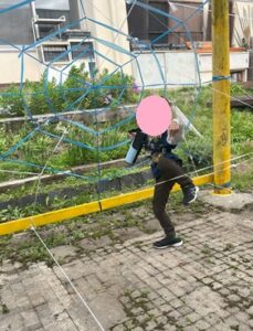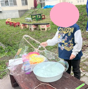 風が強くて割れやすかったのですが、何度もチャレンジして大きなシャボン玉が飛んでいきました!
