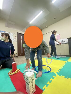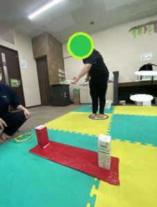 次は輪投げ!指定の場所からよーく狙って輪っかを投げ入れていきます!輪っかと棒の大きさも合間合って、いれるのがとても難しい(>_<)それでもお子さんたちは諦めません!外してしまってもとても楽しそうに挑戦してくれていました!