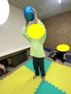 ボールを下にバウンドさせてからキャッチする運動です!みんな両手を高く上げ、強く床にボールを叩きつけます!時々勢い余って、ボールが違う方向に飛んで行ってしまうお友達もいましたが、五回投げれるので安心です(≧◇≦)