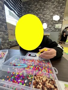 何色もある色から必要な色を取り出し、型にはめていきます。昨日と同様のやり方なのでお手の物!難なくビーズを穴に落とし込んでいきます!