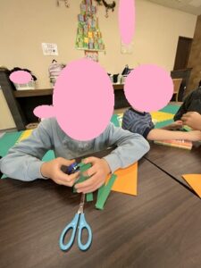 緑の細く切った画用紙を輪にしてホチキスでパチン(∩´∀`)