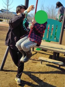 お子さんたちはというと、身体を精一杯揺らしてブランコを漕いだり、ロープにつかまるために高くジャンプしたりとみんな思いのまま体を動かしてとても楽しそうに走り回っていました(*^-^*)