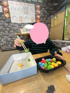 児童によって補助箸や割り箸と変えながら使いやすい物品にしたり持ち方を修正しながら掴む練習に挑戦!🔥