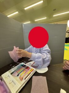 周りのお友達が気になって、気を取られてしまうお子さんがいるためパーテーションを使って簡易的に仕切りを作り、集中できる場所を作成!これで周りを気にせず制作に取り組むことができますね(*’ω’*)