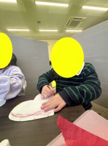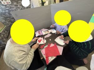 こちらは貼り絵でハートを完成させるお友達!お友達から「貸して」と言われどうしたらいいかわからない様子のお友達。そんな時は「いいよ」「いやだよ」のカードを使って自分の思いをだせるようにしています。このようにカードなどを駆使して、お子さんたちが自分から気持ちの発信ができるよう、様々な方法で支援しています!