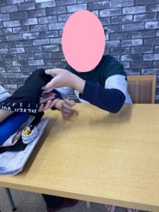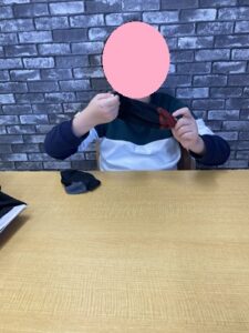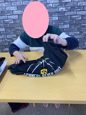 課題に取り組んでいます!今日は日常でのシャツをたたむという動作です。前にもやっているので所々スタッフが端と端を合わせるように声をかけています。