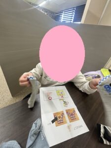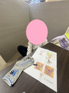 靴下を履くのって意外と難しくないですか?毎日履く靴下ですが、なんかかかとの部分が上や横にきてしまったりねじれてなんだか気持ち悪~い…(>_<)なので今日は靴下を履く練習をしてみました!まず写真や絵を見て靴下がどうなっているか確認しています!