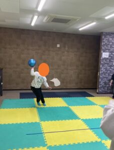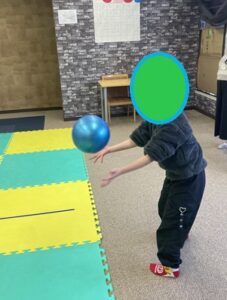 遊んでいるお友達はとても楽しそう!ジャンプをしながら投げてみたり、すこし助走をつけてみたりとあらゆる手を使ってボールを投げてきます。まだまだ元気いっぱいですね!