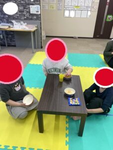 運動や静かなかつどうが終わるり、ドッヂボールを一緒にやっていたお友達が机を囲みおやつを食べていました!三人ともとても疲れた様子(;^ω^)あれだけ体を使って遊んだら疲れますよね💦