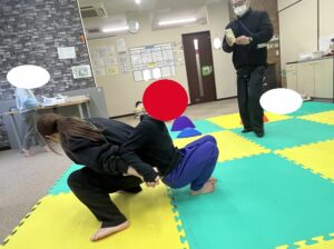 三つめは背中を合わせて協力しながら立ち上がる運動です!