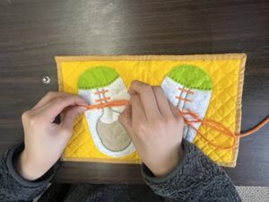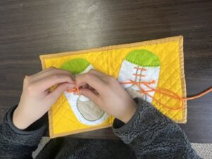 靴紐を結ぶ練習も