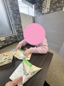 折り紙感覚なので、とても楽しそうに行うお友達!スタッフの折り方をよーく見てお手本通りに角と角を合わせて折っていきます!