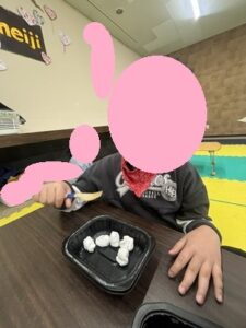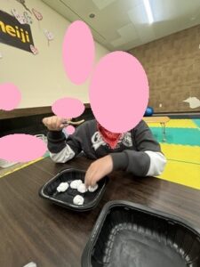 難しいためか手で移そうとしてしてしまいましたがスタッフがフォークを使うようにと動作誘導しました。