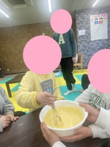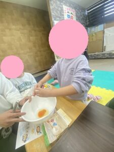 タマゴを割る係、牛乳を測って入れる係(*^-^*)