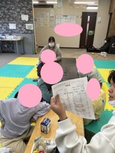 まずは作る工程を見せながら説明しました。そしてみんなそれぞれ役割を伝えました。