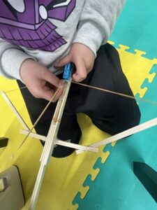 割りばし、輪ゴム、洗濯ばさみ、竹串を使って弓を作りました!