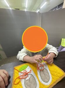 次は紐を結ぶ!です。紐をリボン結びにするのって難しいですよね!頑張って練習中です!(^^)!
