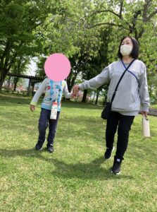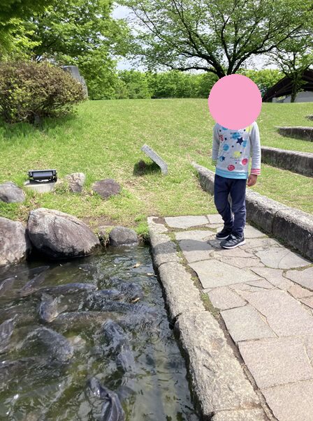 遊具で少し遊ぶと次はハイウェイオアシスの周辺をお散歩に行きました。池に近づくと、鯉が大量に足寄せてきて、後ずさりするお友達(+_+)少しびっくりしてしまいましたね💦